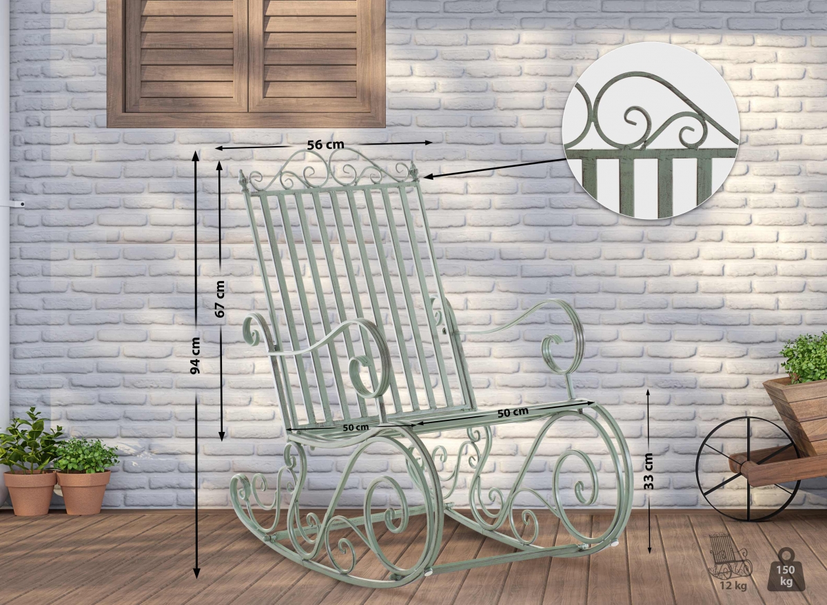 Pohodlné a štýlové hojdacie kreslo s vysokými podrúčkami a operadlom pre príjemné sedenie. Ponúka jemný tvar, pekné detaily a pevnú konštrukciu s nosnosťou až 130 kg, rozmery 94 x 56 x 90 cm.