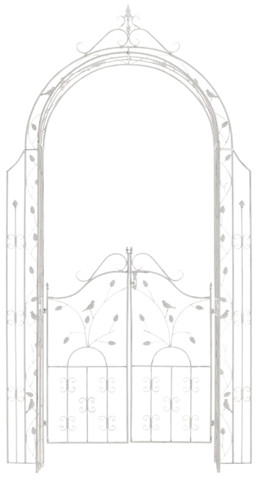 Exkluzívna železná pergola na popínavé rastliny s ozdobnými detailmi. Ideálna pre ruže, stabilná konštrukcia s možnosťou ukotvenia, rozmery 144x270x36 cm, prejazdná šírka 100 cm.