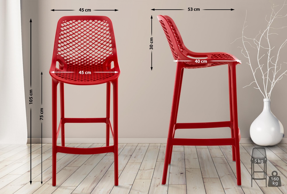 Elegantná barová stolička z polypropylénu s výškou 105 cm a nosnosťou 115 kg. Vodoodolná a UV odolná, s chrbtovou opierkou a chráničom podlahy, vhodná do každého obývacieho priestoru.
