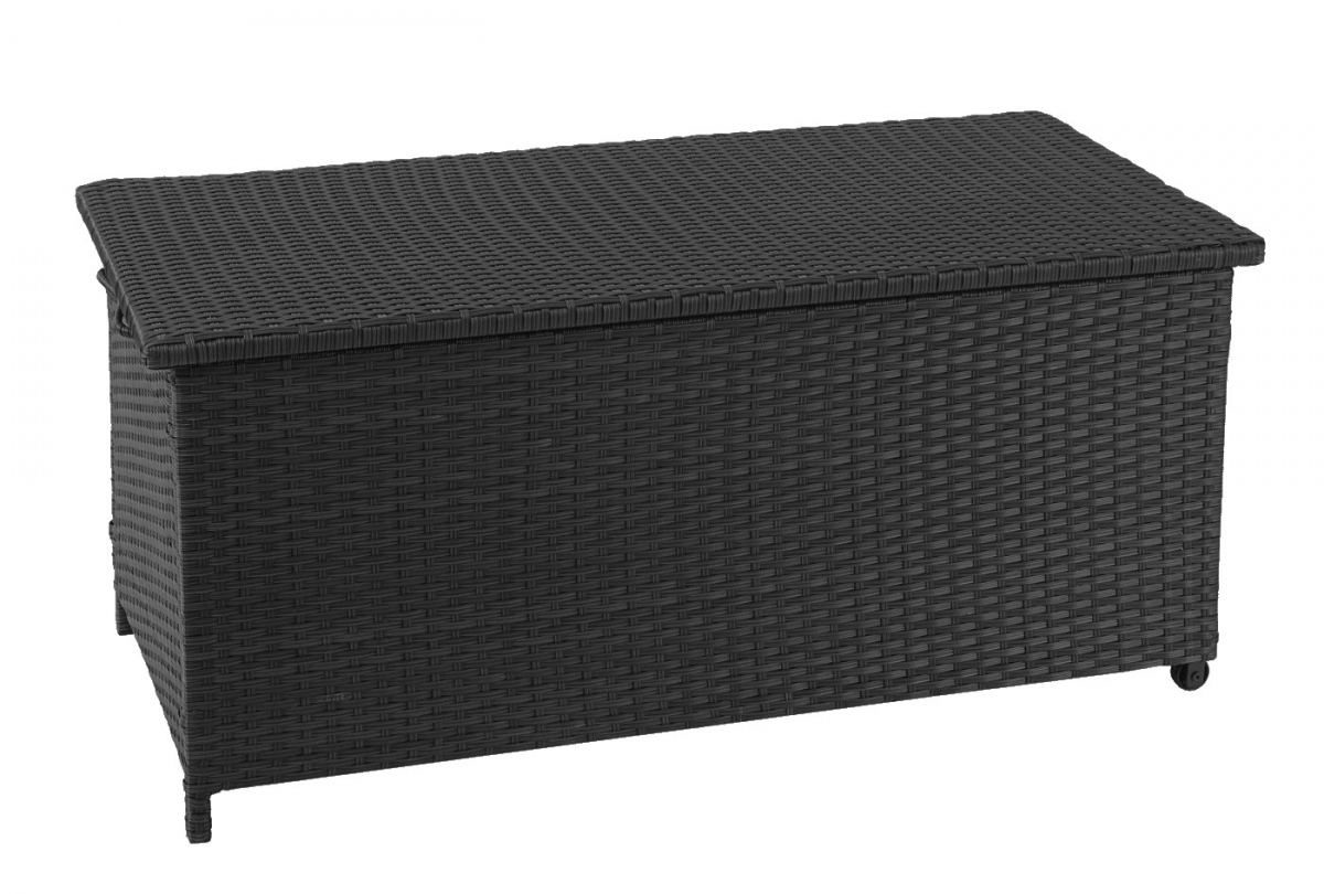 Vo vnútri sa nachádza vodoodpudivý poťah, ktorý sa dá v prípade potreby rýchlo odstrániť pomocou suchého zipsu. Pre väčšiu stabilitu je viečko spevnené PVC vložkou, takže túto truhlu môžete veľmi dobre používať aj ako odkladací priestor. Vnútorný poťah je vodoodpudivý, ale nie vodotesný. To znamená, že s časom preniká, ako pri všetkých známych poly-ratanových boxoch, vlhkosť. Odporúčame vám preto umiestniť ju na miesto chránené pred dažďom. Vďaka dvom kolieskam na jednej strane sa truhla veľmi jednoducho presúva, keď ju položíte, má truhla na druhej strane stabilný stojan. Pomocou uch na oboch stranách je poly-ratanová truhla v nevyplnenom stave veľmi ľahko prenášateľná.