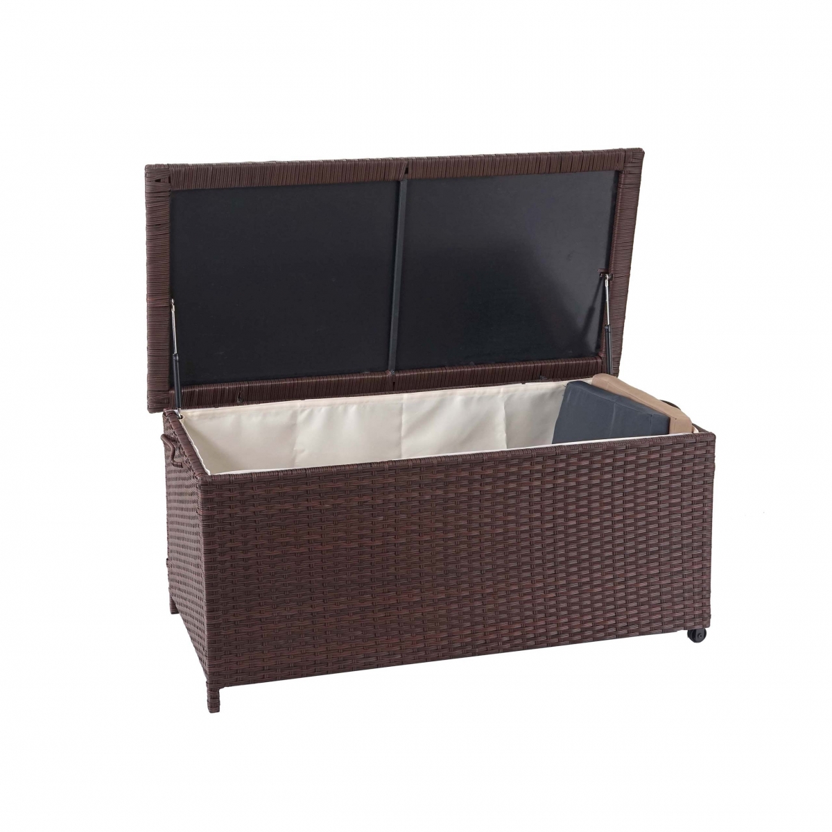 Vo vnútri sa nachádza vodoodpudivý poťah, ktorý sa v prípade potreby dá rýchlo odstrániť pomocou suchého zipsu. Pre väčšiu stabilitu je viečko spevnené PVC vložkou, takže túto truhlu môžete veľmi dobre využiť aj ako odkladaciu plochu. Vnútorný poťah je vodoodpudivý, ale nie vodotesný. To znamená, že s časom preniká, ako pri všetkých známych poly-ratanových boxoch, vlhkosť. Odporúčame vám preto umiestnenie na mieste chránenom pred dažďom. Vďaka dvom kolieskam na jednej strane sa truhla veľmi jednoducho presúva, ak ju položíte, má truhla na druhej strane stabilný stojan. Pomocou uch na oboch stranách je poly-ratanová truhla v nevyplnenom stave veľmi ľahko prenášateľná.