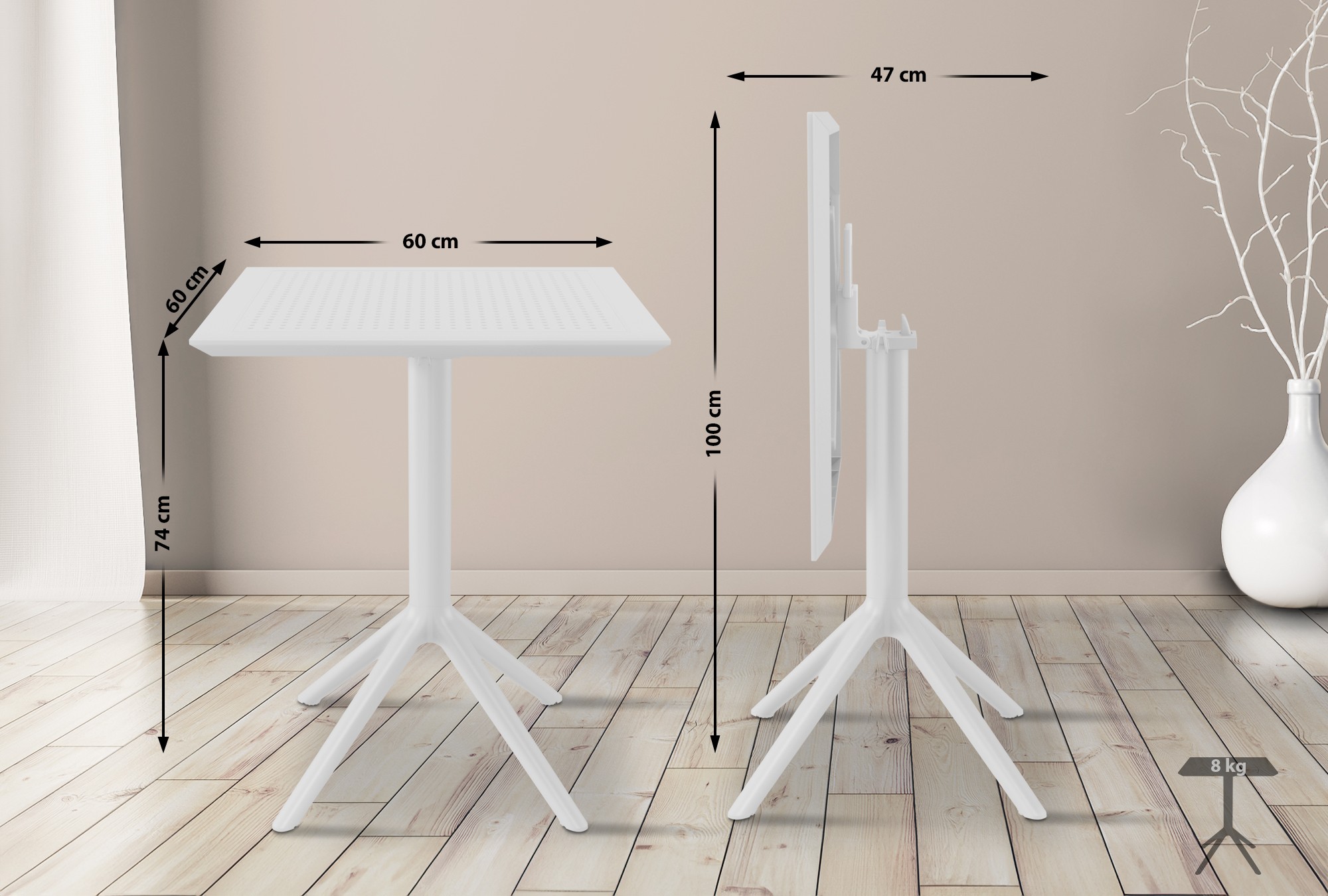 Ľahký skladací stôl Sky s UV odolným povrchom pre interiér aj exteriér. Vhodný ako bistro stôl alebo na terasu, s výberom okrúhlej alebo štvorcovej dosky 60 cm. Praktický na podujatia vďaka jednoduchému skladaniu.