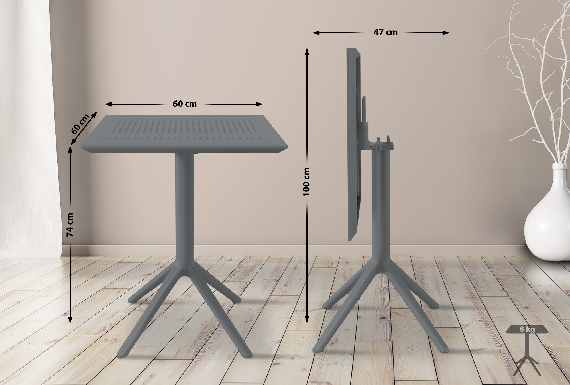 Ľahký skladací stôl Sky s UV odolným povrchom pre interiér aj exteriér. Vhodný ako bistro stôl alebo na terasu, s výberom okrúhlej alebo štvorcovej dosky 60 cm. Praktický na podujatia vďaka jednoduchému skladaniu.